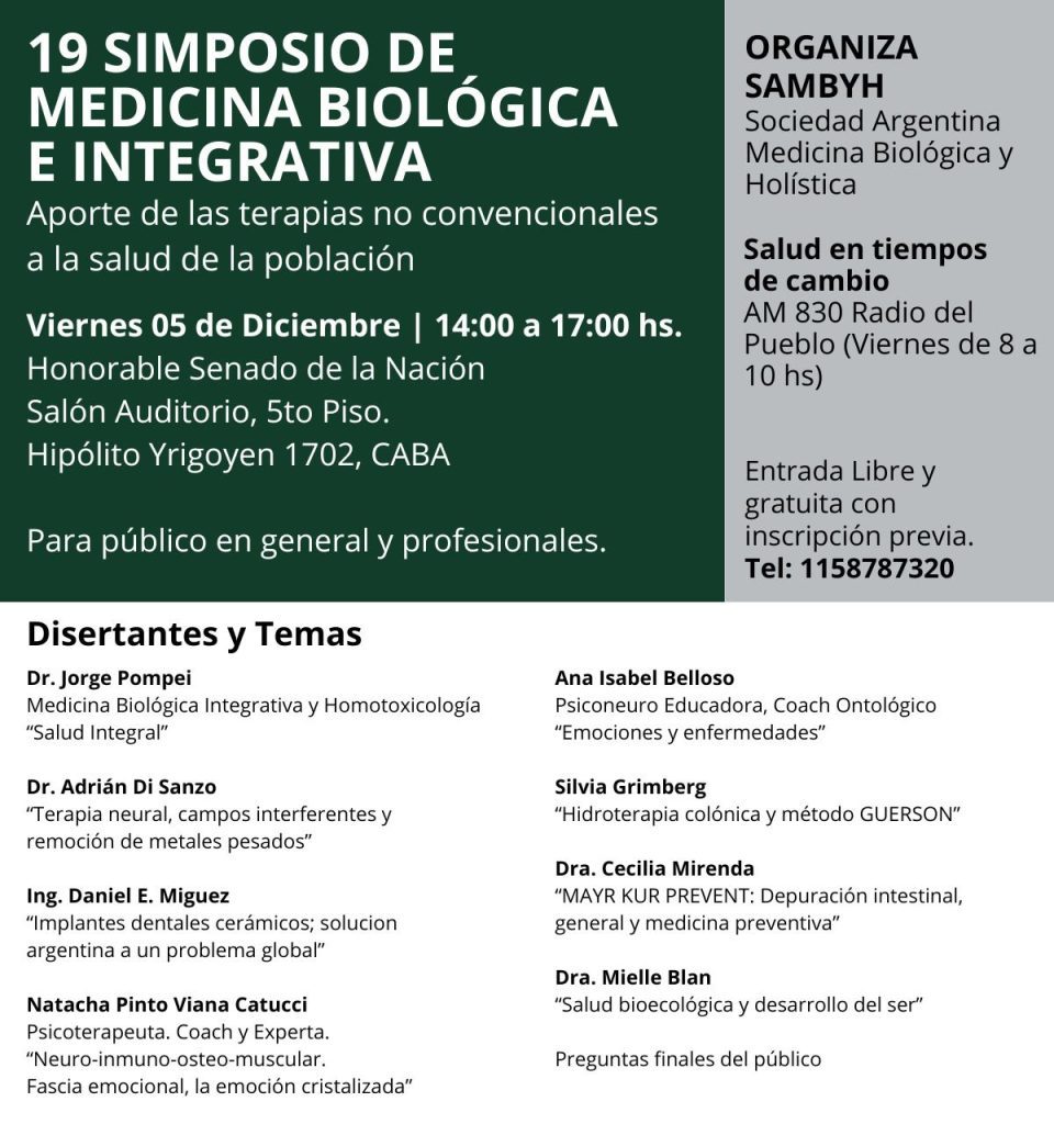 El próximo viernes 5 de diciembre, de 14 a 17 horas, se llevará a cabo el 19° Simposio de Medicina Biológica e Integrativa en el Honorable Senado de la Nación, Salón Auditorio del 5° piso, ubicado en Hipólito Yrigoyen 1702, Ciudad Autónoma de Buenos Aires. La actividad es abierta al público y gratuita, con inscripción previa.