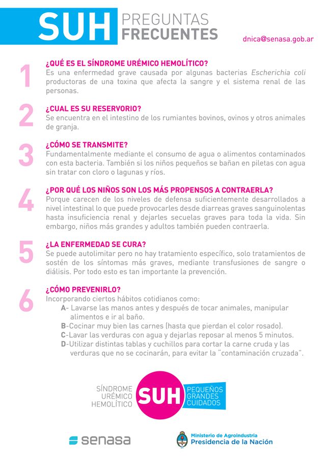 Sobre esta línea, el SENASA viene trabajando en la Campaña de Comunicación “SUH: pequeños grandes cuidados” difundiendo y promoviendo medidas de prevención para evitar el contagio de esta enfermedad transmitida por alimentos (ETA) y cuidar la salud de las personas.